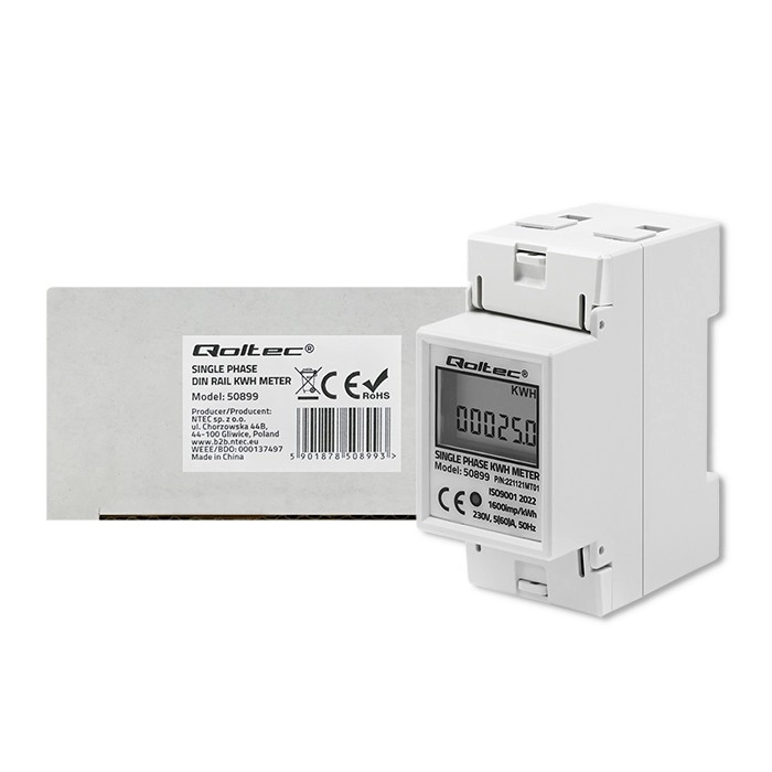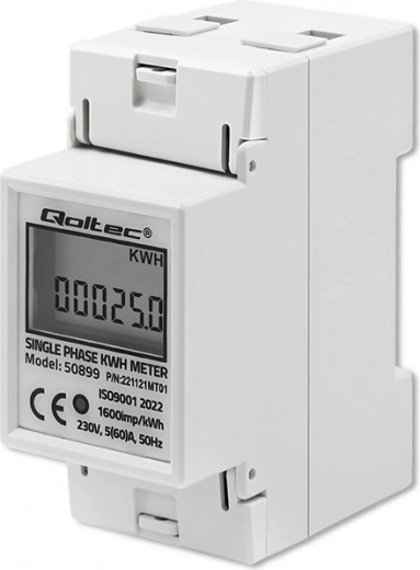 Qoltec elektrooniline energiaarvesti pakub pidevat monitooringut ühefaasilistele 230 V / 50 Hz vahelduvvooluga seadmetele. See on varustatud LED-indikaatoriga, mis näitab energiatarbimist, ning LCD-ekraaniga, mis kuvab tarbitud energia väärtust impulsside arvu alusel konstantiga 1600 imp/kWh. Arvesti on mõeldud paigaldamiseks TH35 DIN-liistule, mis võimaldab lihtsat paigaldust ja kasutust.