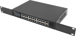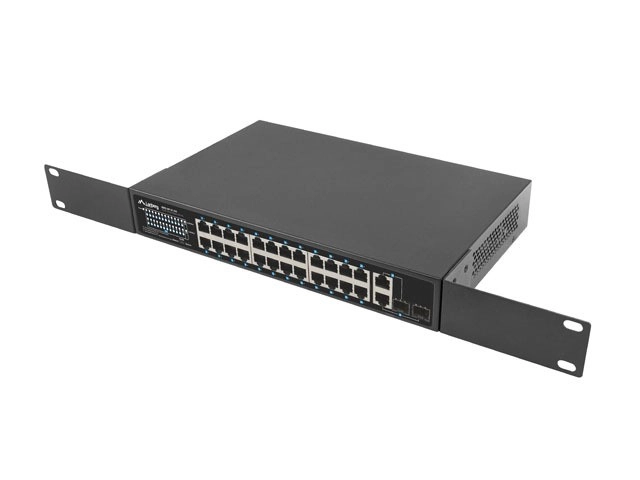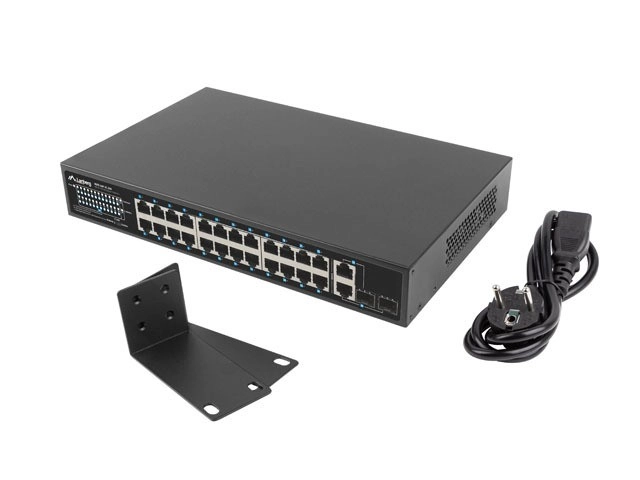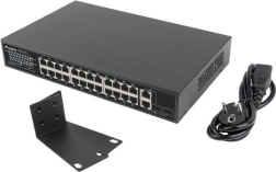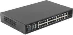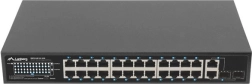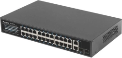 24 PoE+ 10/100 Mb/s porti toidavad ja edastavad andmeid ühe kaabli kaudu. Reaalne 250 W eelarve võimaldab samaaegselt toita kuni 16 seadet 802.3af (15 W/port) või 8 seadet 802.3at (30 W/port).