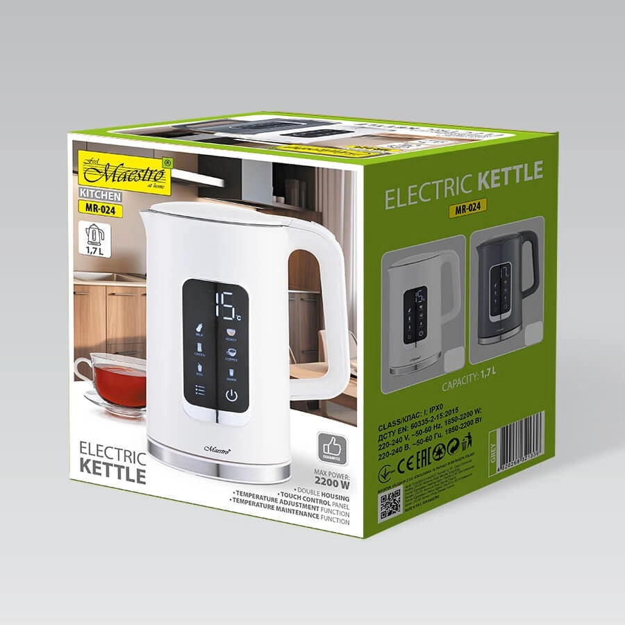 Temperatuurivahemik on 40°C kuni 100°C. Keetja on varustatud helisignaaliga soovitud temperatuuri saavutamisel ja sooja hoidmise funktsiooniga kuni 2 tunniks. Energiasäästurežiim hoiab kokku energiat, kui aktiivne on ainult toitenupp. Elegantne disain ja funktsionaalsus teevad Maestro veekeetjast ideaalse lisandi igasse majapidamisse.