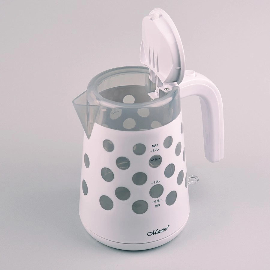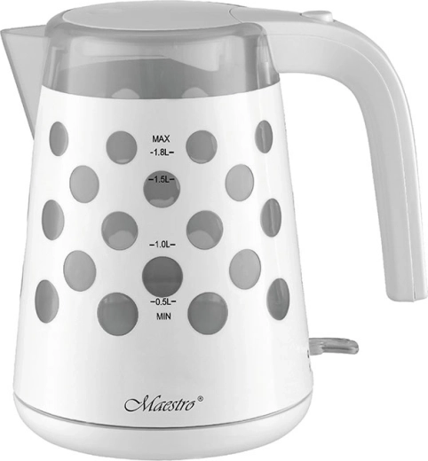 Valge Maestro KROPKI veekeetja sobib suurepäraselt igasse kööki. 1,7-liitrise mahutavuse ja 2200 W võimsusega tagab see kiire vee keetmise. Peidetud küttekeha parandab mitte ainult välimust, vaid teeb ka puhastamise lihtsamaks, samal ajal kui sinine LED-taustvalgus lisab modernse ilme.