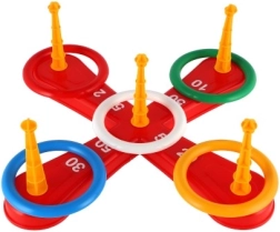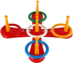 See rõngastega rist-viskemäng ühendab suurepäraselt lõbu ja õppimise. Suurepärane viis laste käe-silma koordinatsiooni arendamiseks mängimise käigus. Komplektis on risttüüpi alus viie postiga ning värvilised rõngad, mida visata postidele, et koguda punkte.