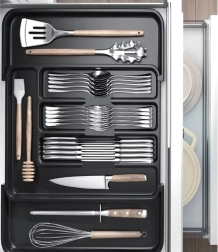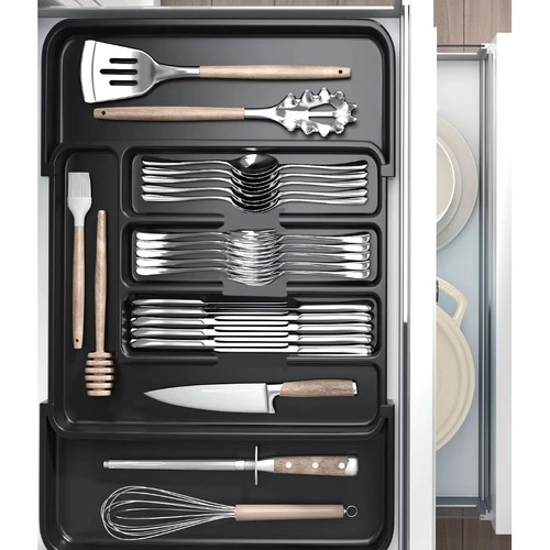 Maksimeerige sahtliruumi nutika venitatava disainiga. Korraldajat saab sujuvalt seadistada erineva laiusega sahtlite jaoks, nii et söögiriistad, noad ja kulbid on alati korrapäraselt paigutatud. Vastupidav PP-konstruktsioon tagab pika kasutusea, kriimustuskindluse ja lihtsa hoolduse.