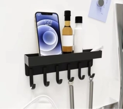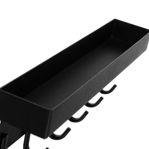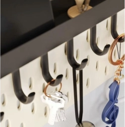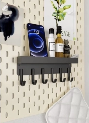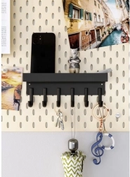 See universaalne seinakorraldaja ühendab funktsionaalsuse ja minimalistliku disaini. Metallkonstruktsioon pulbervärviga tagab pika kasutusea, samas kui ülemine riiul kõrgendatud äärega (u 2,3 cm) hoiab turvaliselt telefoni, rahakotti, posti või pisiesemeid. Kuus tugevat konksu sobivad suurepäraselt võtmetele, sallidele, kottidele või köögitarvikutele.