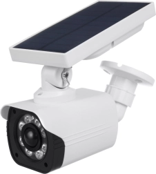 Professionaalse välimusega päikesetoitel turvakaamera atrapp soovimatute külaliste peletamiseks aias või hoovis. See pakub PIR liikumisandurit, hämarikuandurit, võimsat 5 W LED-valgust (kuni 800 lm) ja IP66 kaitset. Päikeseenergial töötades ei vaja see voolu ja kestab madala valguse režiimis kuni 40 tundi ühe laadimisega.