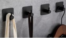 Modernsed isekleepuvad RUHHY konksud ühendavad vastupidava roostevaba terase ja tugeva pulbervärvkatte elegantses matt mustas viimistluses. Tänu tugevale montaažiteibile püsivad need kindlalt ka suurema õhuniiskusega keskkonnas ning kannavad kuni 3 kg ühe konksu kohta. Praktiline konksuots takistab ka raskete ja märgade rätikute libisemist.
