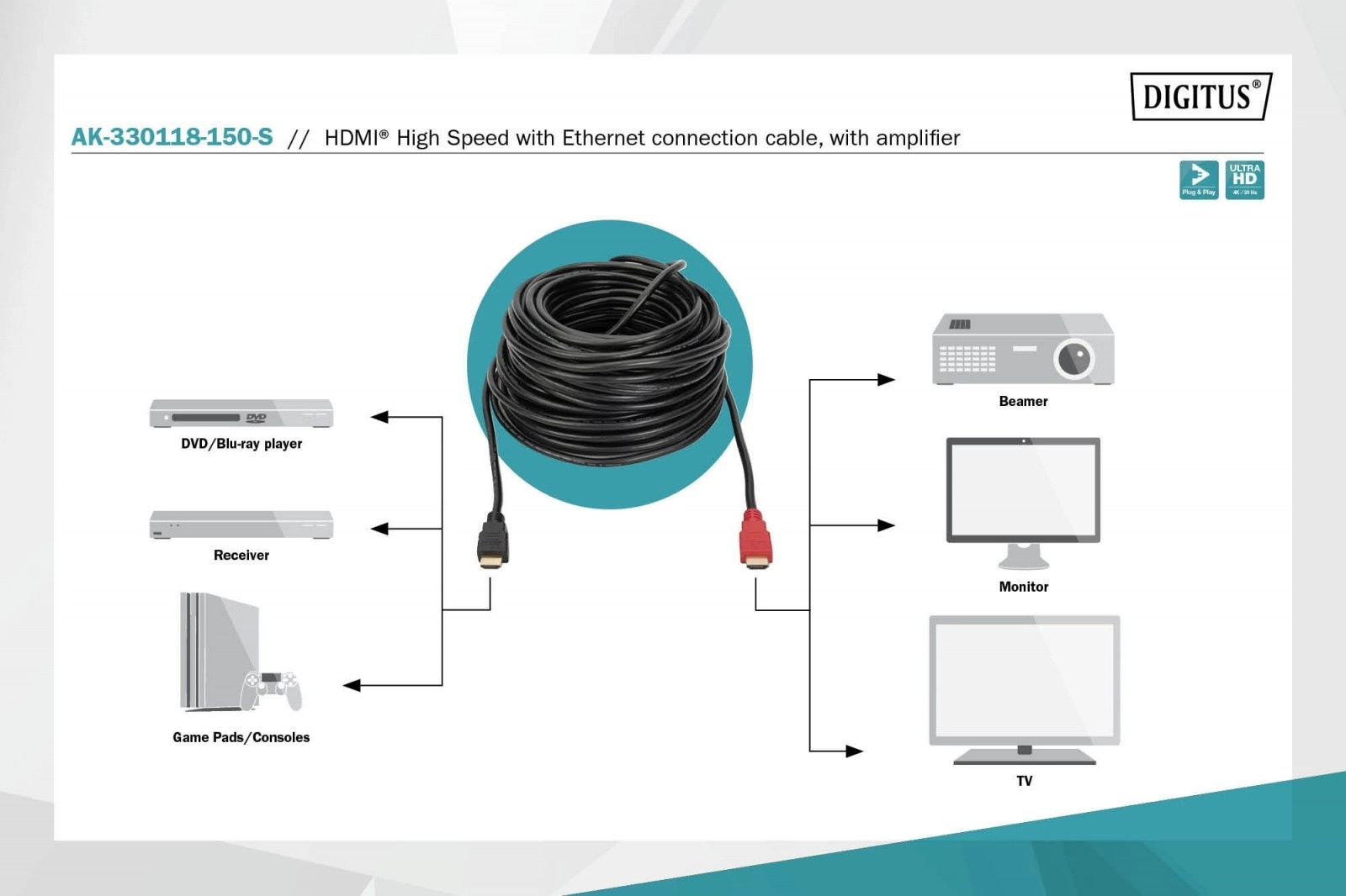 - Aktiivne ja suunatud teostus – korrektseks toimimiseks järgige ühenduse suunda (allikas → ekraan).