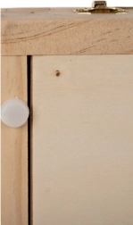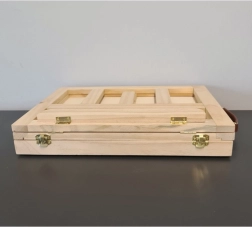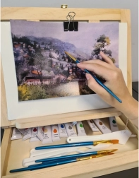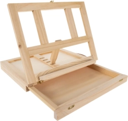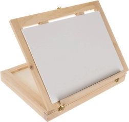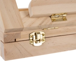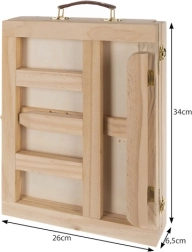 Puidust kohver on varustatud sahtli ja molbertiga, mis tagavad kunstitarvete lihtsa transportimise ja korrastamise.