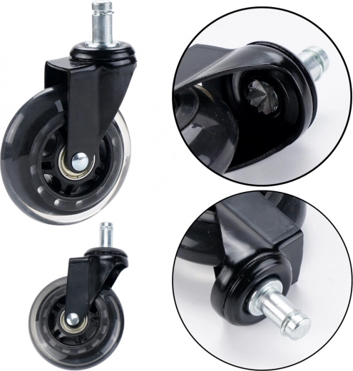 Pehme ja elastse pinnaga kummirattad sobivad suurepäraselt puitpõrandatele, paneelidele, laminaadile, plaatidele ja vaipadele, kaitstes neid kahjustuste eest. Iga ratta stabiilne metallkonstruktsioon tagab suure vastupidavuse kandevõimega kuni 50 kg, pakkudes töökindlust ka intensiivsel kasutamisel kontori- ja mänguritoolidel.