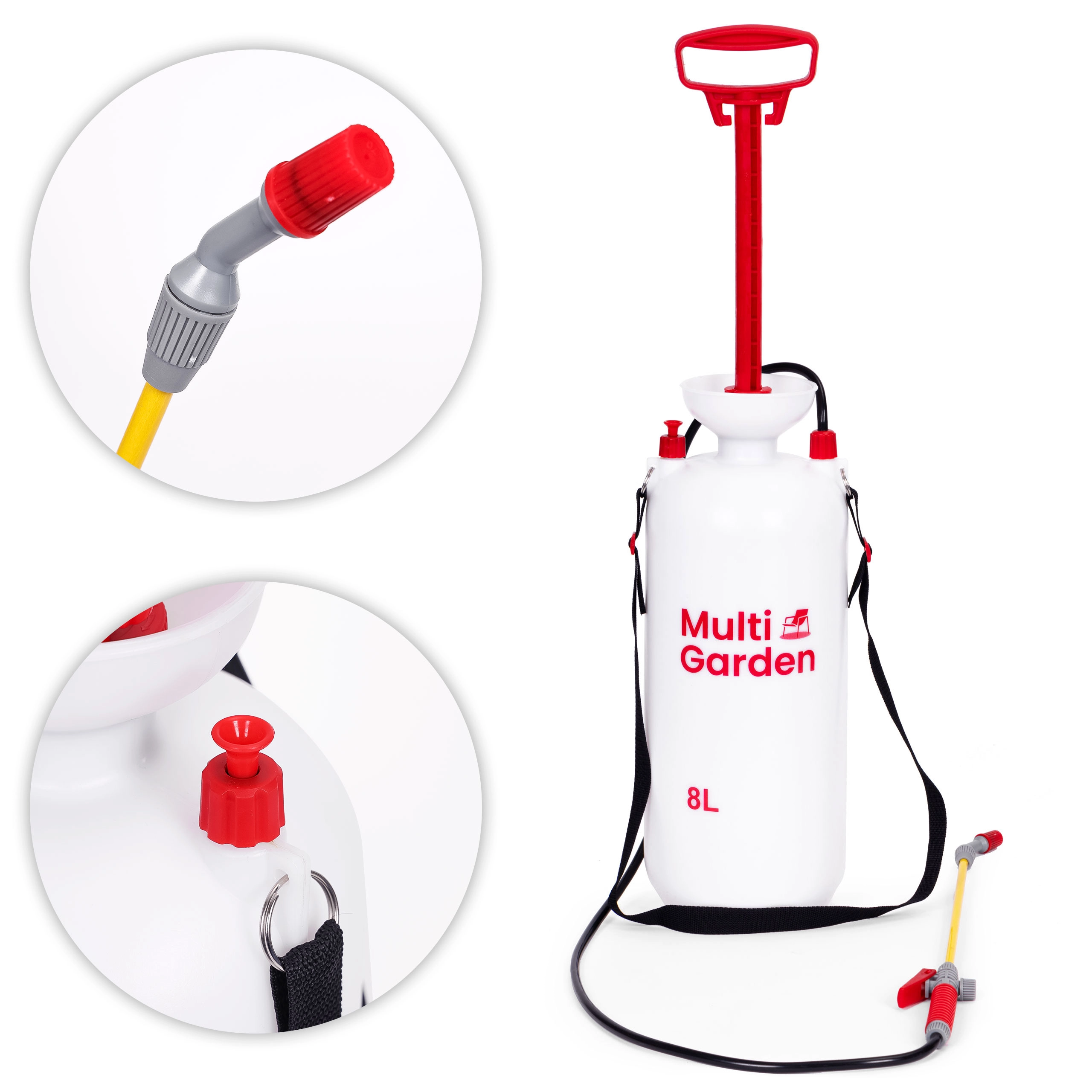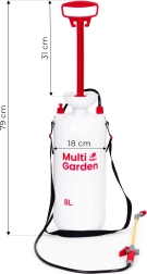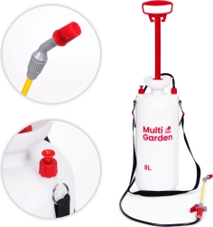 Praktiline MULTIGARDEN 8 l survepihusti mugavaks aia hoolduseks ja kodu ümbruse puhastamiseks. Pakub reguleeritavat düüsi (lamerõhk ja koonuspilv), pikka klaaskiust landi, kolbpumpa, ohutusklappi ja mõõteskaalat paagil. Tänu ergonoomilisele sangale ja reguleeritavale rihmale on pihustit mugav kanda ja kasutada.