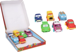 Kerge pehmest plastist auto pikkusega 9 cm ja vabalt veerevate ratastega. Valida on 6 variandi vahel: Põrnikas, Trabant, sportauto, Mini, autobuss, kaubik.