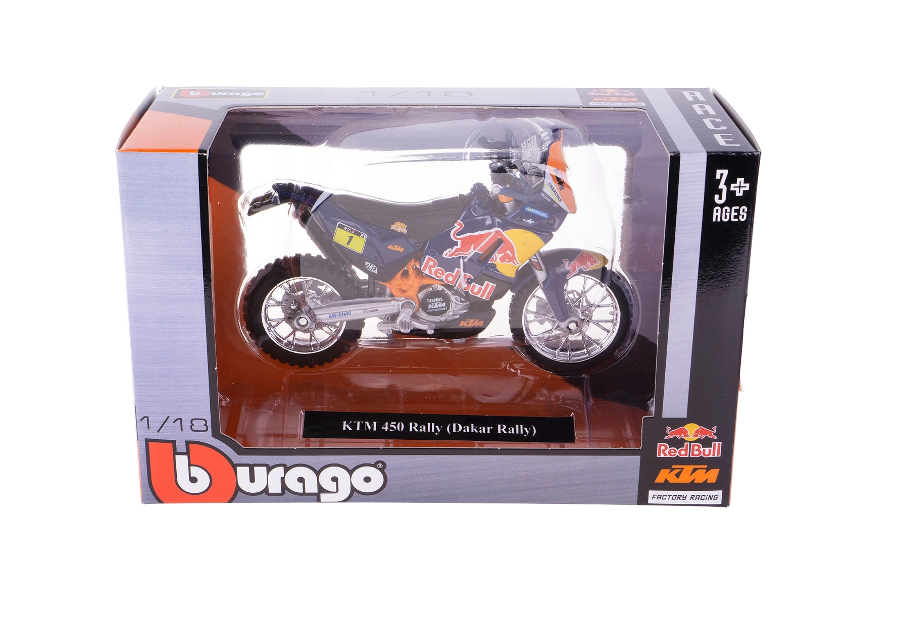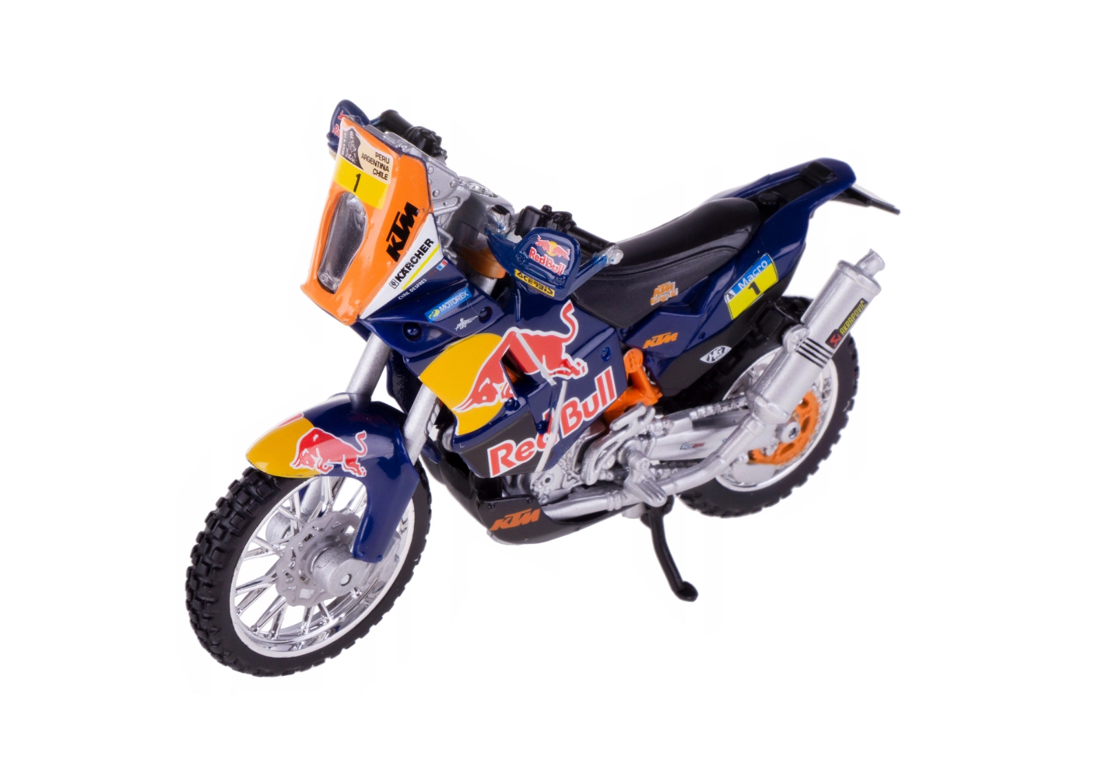 Avastage täpne koopia võistlusspetsiaalist Red Bull KTM Factory Racing legendaarse Dakari ralli jaoks. Bburago 1:18 mõõtkavas mudel avaldab muljet kvaliteetse metallkere, peente plastdetailide ja meeskonna autentse värvilahendusega.