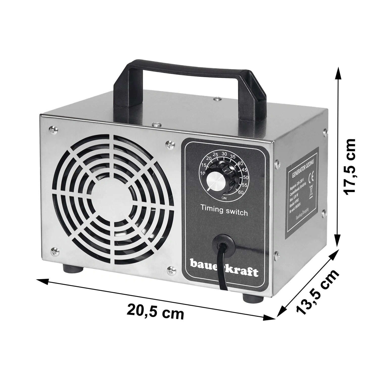 Võimas osoonigeneraator on ideaalne abiline deodoriseerimiseks ja steriliseerimiseks ruumides, sõidukites ja väiksemates ettevõtetes. Tänu võimsusele 60 000 mg/h vähendab see kiiresti mikroorganisme ja allergeene ning jätab õhu puhtaks ja värskeks. Tugev roostevabast terasest korpus tagab pika tööea ja lihtsa hoolduse.