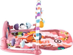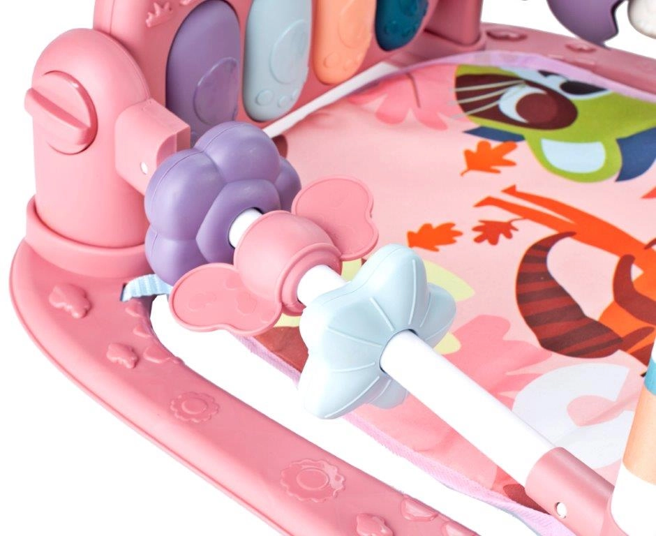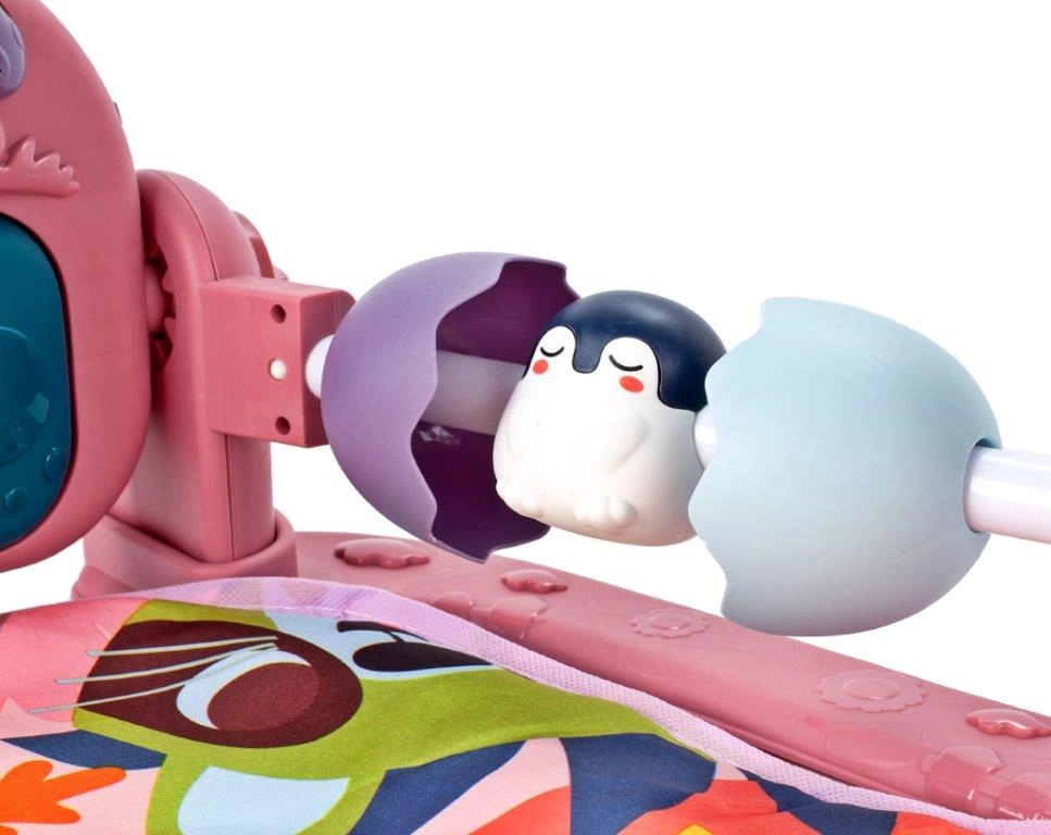 See roosa hariv mängualus loob turvalise ja stimuleeriva koha igapäevaseks mänguks. Värviline rippkaar mänguasjadega julgustab beebit sirutama ja haarama, mis arendab silma–käe koostööd. Interaktiivne klaver valgustatud klahvidega pakub 3 helirežiimi – heliredeli Do–Re–Mi–Fa toonid, lühikesed helid (nt lapse naer) ja pikemad meloodiad – ning toetab kuulmise ja rütmitaju arengut.