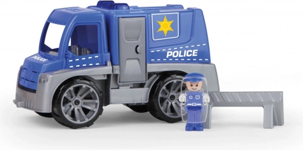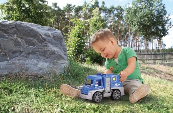 Tugev kvaliteetsest plastist politseiauto lastele alates 2. eluaastast. Pakub mehaanilisi funktsioone ilma patareideta, avamiseks mõeldud uksi, üleskäänatavat kabiini ja kilbiga politseiniku figuuri loominguliseks mänguks kodus ja liivakastis.