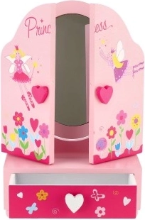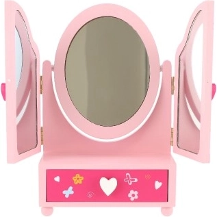 Puidust tualettpeegel ehtesaaliga Princess on suurepärane lisa lastetuppa. Keskmist ovaalset peeglit täiendavad kaks külgpaneeli mugavaks nurga seadistamiseks. Alumises osas on praktiline sahtel, kuhu lapsed saavad oma väikesed aarded paigutada. Õrn kaunistus haldjate, lillede ja südametega toetab fantaasiat ja mängurõõmu.