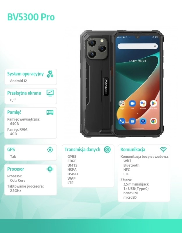 Blackview BV5300 Pro paistab silma 6,1" IPS-ekraaniga, mis pakub tänu 1560 x 720 pikslisele eraldusvõimele selget ja teravat pilti. Võimas kaheksatuumaline protsessor MediaTek Helio P35 töötab kuni 2,3 GHz taktsagedusel, tagades kiire ja sujuva süsteemi töö, mida toetavad 4 GB RAM ja 64 GB sisemälu. Mälu saab laiendada microSD-kaardiga kuni 512 GB, pakkudes rohkelt ruumi kõigeks vajalikuks.