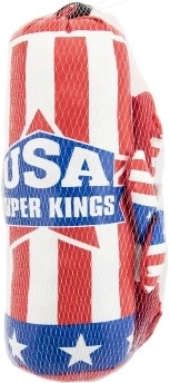 Lõbus ja ohutu komplekt väikestele sportlastele: laste poksikott kinnastega Ameerika lipu motiiviga. Ideaalne energia väljaelamiseks, koordinatsiooni arendamiseks ja mänguliseks tegevuseks. Kerge ja kompaktne, lihtsasti kaasaskantav ja sobib alates 3. eluaastast.