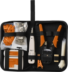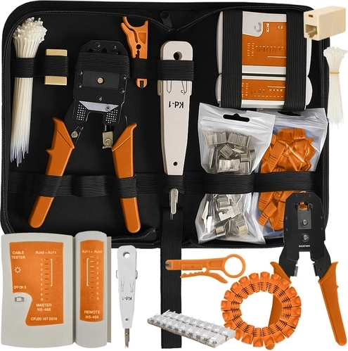 Komplekt sisaldab kõiki vajalikke tööriistu: krimptange, isolatsioonieemaldajat, pistikute paigaldusvahendit, RJ45 pistikuid ja kesti ning esteetilist vutlarit, mis võimaldab tööga kohe alustada.