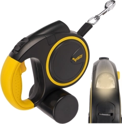 Praktiline 5 m pikkune automaatne jalutusrihm 10–25 kg koertele. Pakub tugevat ja vastupidavat linti, viivitut kontrolli STOP-piduri abil, ergonoomilist käepidet ja integreeritud LED-taskulampi turvalisteks jalutuskäikudeks hämaras. Komplektis on ka kotihoidik ja kvaliteetne pöörlev karabiin väänemise vältimiseks.