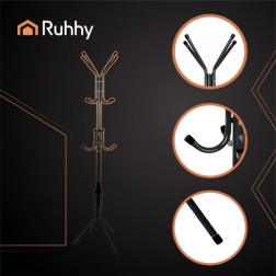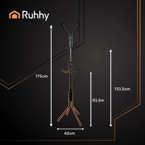 Elegantne RUHHY seisev riidenagi pakub praktilist ja stabiilset lahendust esikusse, magamistuppa, kontorisse ja ooteruumi. Tänu kolmele riputustasemele, tugevale metallkonstruktsioonile 4 jalal ja ümaratele konksuotsadele hoiab see mantlid, joped, sallid ja kotid turvaliselt ning korrapäraselt. Vabaltseisev teostus võimaldab lihtsat ümberpaigutamist ilma puurimise ja tööriistadeta.