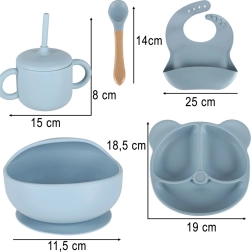 See täielik laste silikoonist söögikomplekt on loodud mugavaks ja turvaliseks toitmiseks ning iseseisva söömisoskuse harjutamiseks. Iminapaga kauss ja jaotistega taldrik püsivad kindlalt laual või söögitooli alusel, vähendades märgatavalt einestamisega kaasnevat segadust. Pehme, vastupidav ja mittelibisev silikoon on meeldiv puudutusele ja kergesti puhastatav.