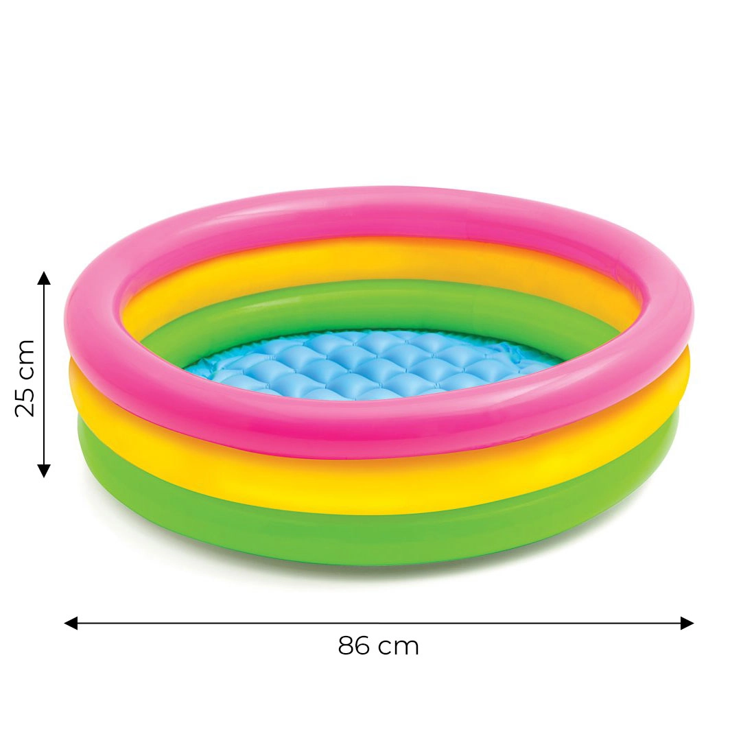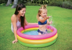 INTEX täispuhutav bassein toob lastele veemängurõõmu otse teie aeda. Tänu kompaktsetele mõõtudele 86 × 25 cm mahub see peaaegu kõikjale ning madal veetase 17 cm suurendab pisemate turvatunnet. Vikerkaarevärvides kujundus on pilkupüüdev ja kutsub mängima.
