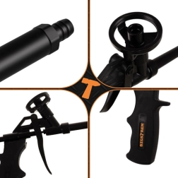 Vastupidav täismetallist korpus tagab töökindluse ja pika eluea ka intensiivsel kasutamisel. Ergonoomiline libisemiskindla pinnaga käepide istub mugavalt kätte ja minimeerib väsimuse pikema töö käigus. Püstol ühildub enamiku tavaliste PU-vahu balloonidega.