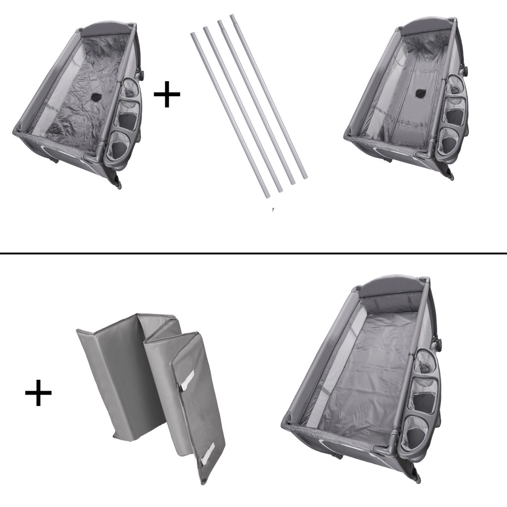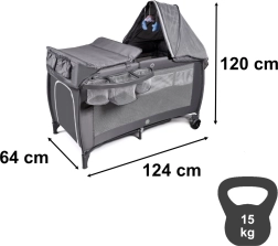 Praktiline reisivoodi beebidele ja väikelastele koos kahetasandilise magamispinnaga, mähkmlaua ja sääsevõrguga mänguasjadega. Tänu kiirkokkupakkimisele, piduritega ratastele ja õhku läbilaskvatele võrk-külgedele tagab mugava une ja lihtsa hoolduse nii kodus kui ka reisil. Korraldajad ja taskud hoiavad kõik vajalikud asjad käepärast.