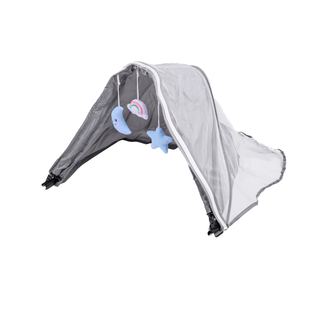 Kerge võrk kaitseb putukate eest ja tagab samal ajal ventilatsiooni. Rippuvad plüüsist mänguasjad (kuu, vikerkaar, täht) arendavad meeli ja lõbustavad beebit.