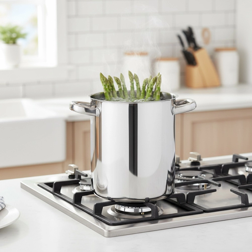 Potil on kõrge korpus, mis sobib suurepäraselt spargli, spagettide ja teiste pikkade toiduainete keetmiseks ilma murdmata.