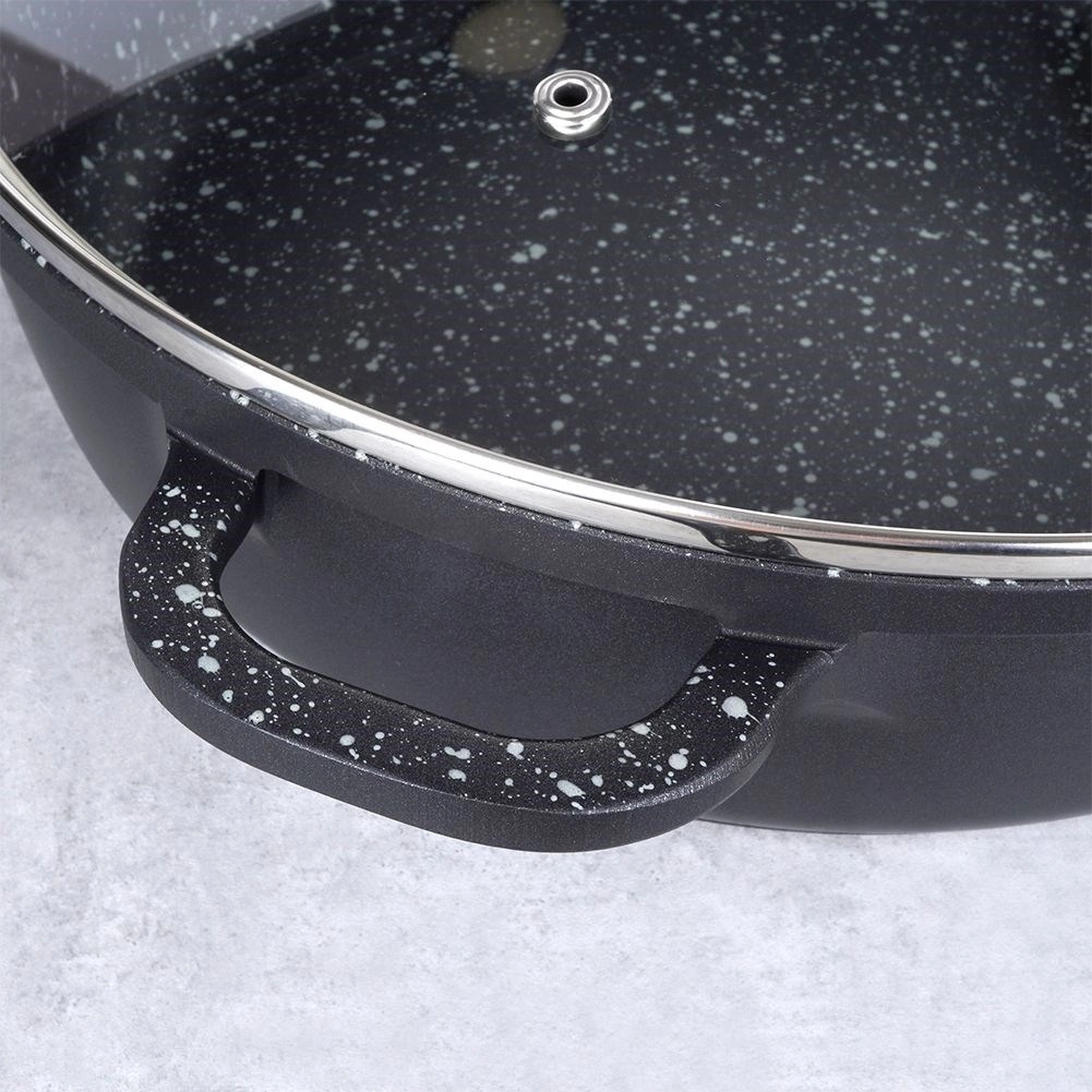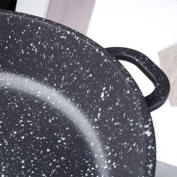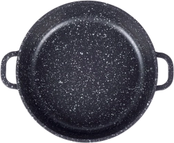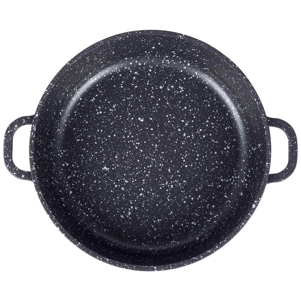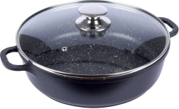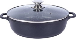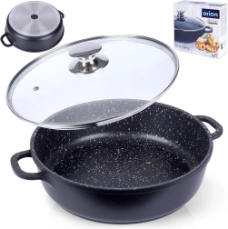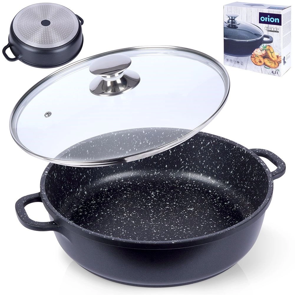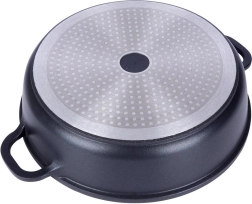 Robustne alumiiniumpann elegantses mustas kivilaadse välimusega viimistluses on seest kaetud kvaliteetse graniitse mittekleepuva PFLUON-kattega, mis peab vastu kõrgetele temperatuuridele ja kriimustustele. Klaasist kaas roostevabast serva ja auruventiiliga lihtsustab toidu jälgimist ning hoiab niiskust mahlakate tulemuste jaoks.