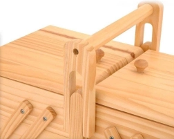 See elegantne puidust õmbluskapp looduslikus toonis pakub läbimõeldud hoiustamist õmblustarvetele ja loomingulistele pisiesemetele. Harmoonikalaadne väljatõmmatav konstruktsioon võimaldab avada kõik tasandid ühe sujuva liigutusega, nii et kõik on kohe käepärast. Tugev sang tagab turvalise ja mugava kandmise.