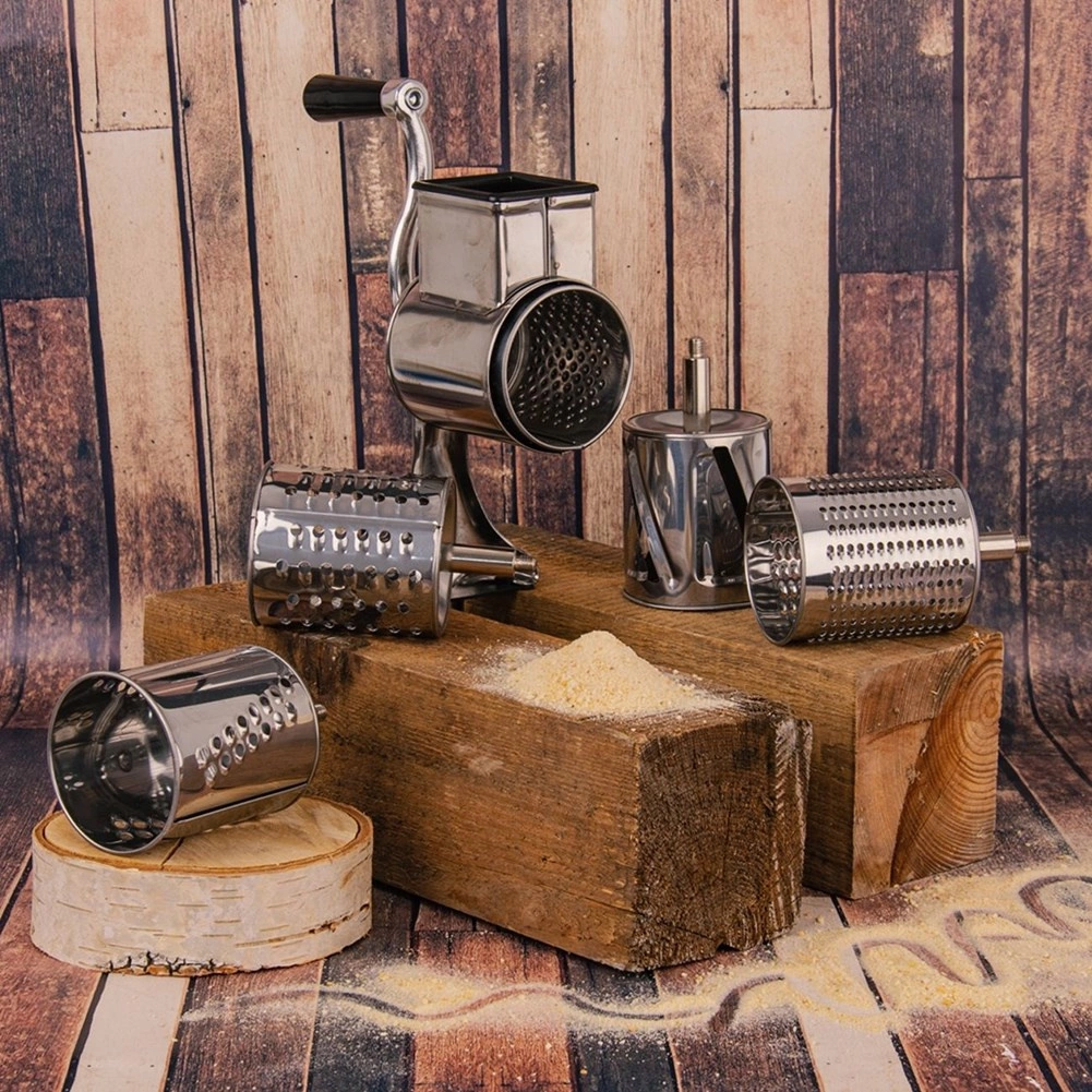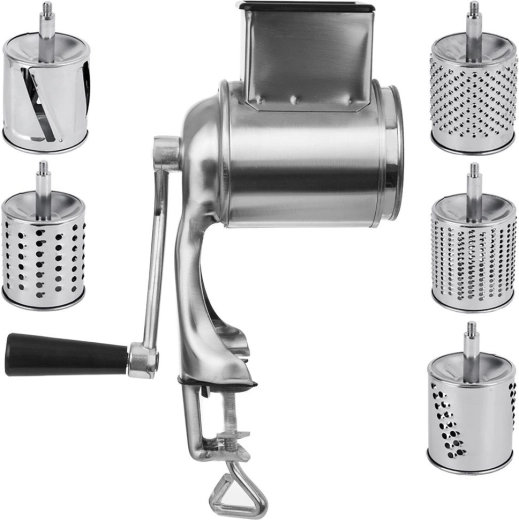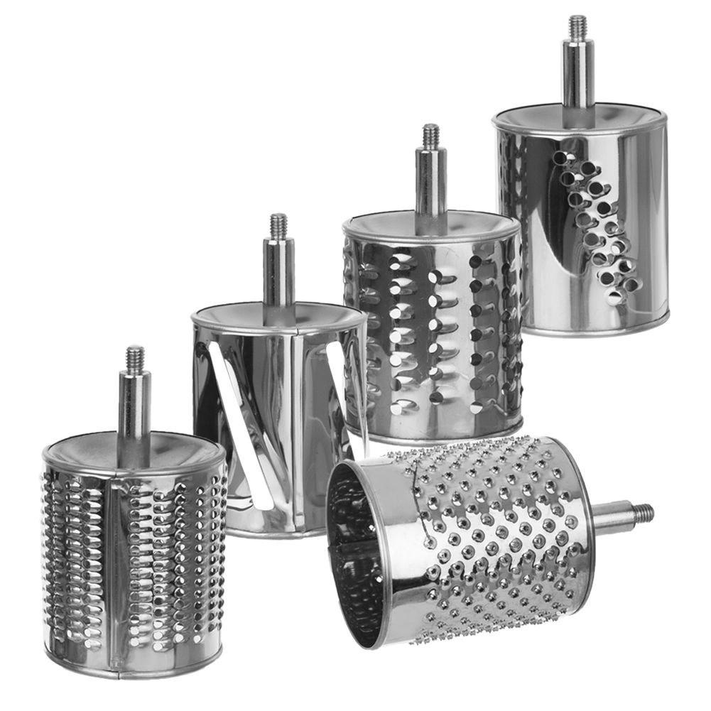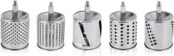 Komplektis on 5 roostevabast terasest trummelit, mis katavad peene ja jämeda riivimise, viilutamise ja purustamise. Ideaalne juustu, pähklite, šokolaadi, köögiviljade ja puuviljade jaoks.
