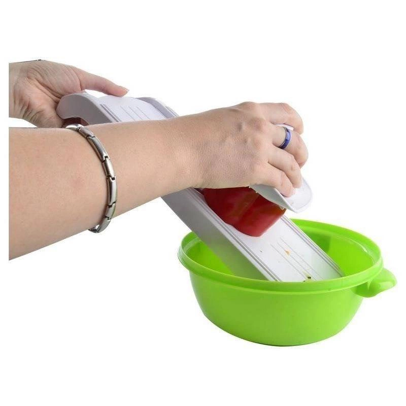 Praktiline köögivilja- ja puuviljalõikur mõõtmetega 36 × 12,5 × 4 cm pakub vahetatavaid otsikuid lõikamiseks ja riivimiseks, teravat roostevabast terasest nuga ning ohutuskinnitust mugavaks ja turvaliseks kasutamiseks. Tänu tugevale konstruktsioonile, kaldus kujule ja kausi servale toetuvale sälgule on lõikamine kiire, täpne ja pingutuseta.