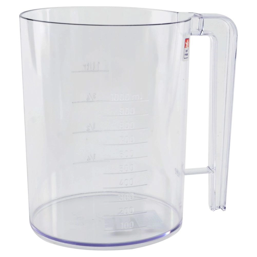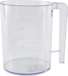 Läbipaistev kann selge skaalaga 100–1000 ml ja märgistusega 1/4–1 l lihtsustab koostisosade koguste ja taigna konsistentsi kontrolli.