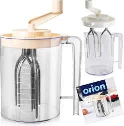 ORIONi käsimikser ühendab vahusti, vispli ja mõõdutopsi ühes. Läbipaistev anum skaalaga (100–1000 ml ja 1/4, 1/2, 3/4, 1 l) lihtsustab koostisosade täpset doseerimist. Mehhaaniline vänt seab sisemised visplid tööle, nii et segamine on tõhus, ilma elektrita ja tänu suletud kaanele ka ilma pritsmeteta.