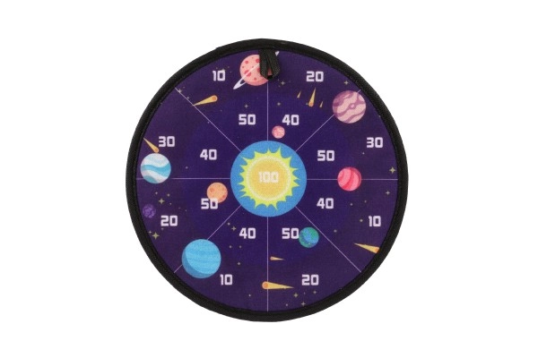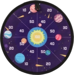Üks sihtmärgi pool on kujundatud pilkupüüdvate värvide ja numbritega traditsioonilise mängu jaoks, samas kui teine pool toob kosmose temaatika koos planeetide piltidega. Lapsed saavad harjutada matemaatikat, liites punkte, mis saadakse üksikute visetega.