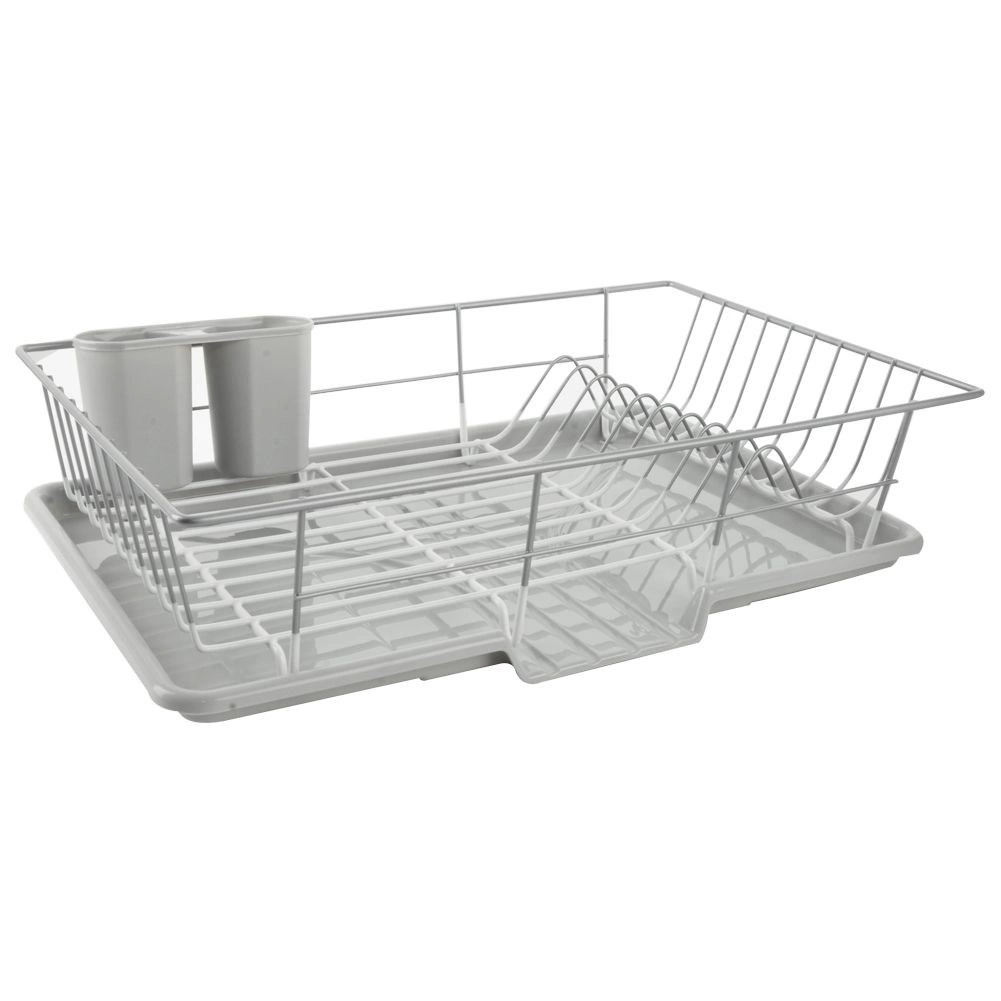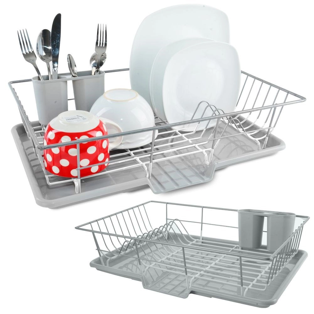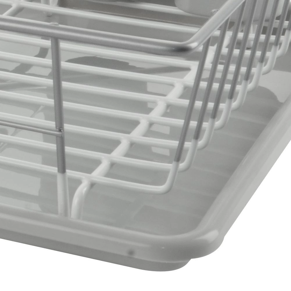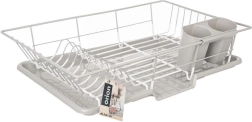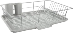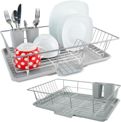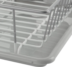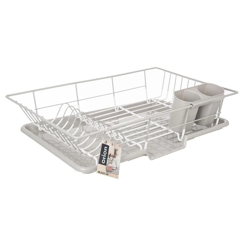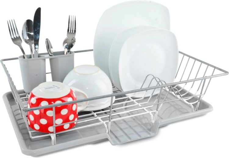 Elegantne ja praktiline nõudekuivatusrest mõõtmetega 46,5 × 31 × 13 cm võimaldab mugavalt kuivatada taldrikuid, kausse, klaase ja söögiriistu, ilma et vesi koguneks köögitasapinnale. Metallkonstruktsioon roostevabast terasest hallikasvalge kaitseviimistlusega on stabiilne, korrosioonikindel ja lihtsasti puhastatav.