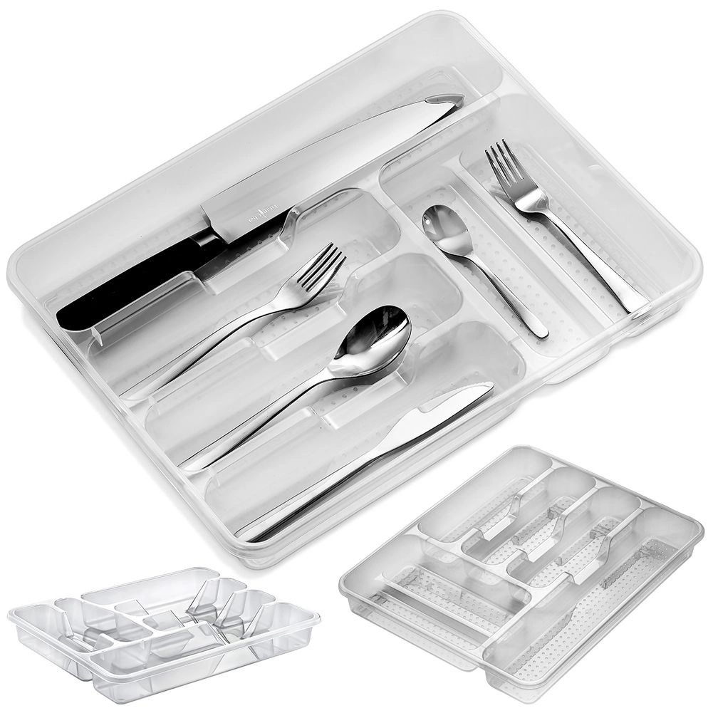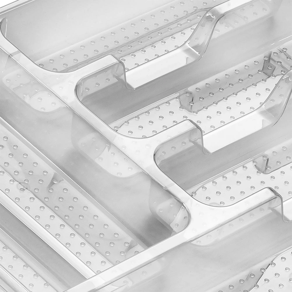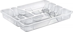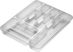 Praktiline köögisahtli korraldaja mõõtmetega 38,5 × 31 × 5 cm hoiab sinu söögiriistad ja väikese köögitarbed selgelt eristatult omal kohal. Tänu läbipaistvale teostusele on sisu alati nähtav, kvaliteetsest plastist tugev konstruktsioon on vastupidav ja lihtsasti hooldatav. Sisu pakub mitut lahtrit erinevate söögiriistade ja köögivahendite jaoks, on ruumikas, praktiline ja sobib igasse kaasaegsesse kööki.