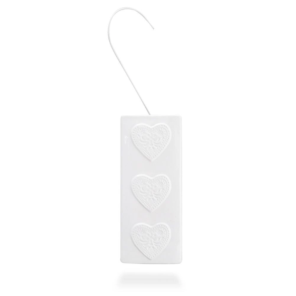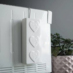 Valmistatud kvaliteetsest keraamikast valges värvitoonis läikiva glasuuriga ning kolme plastse südamega esiküljel. Kitsas ja kõrge kuju säästab ruumi ning võimaldab mugavalt riputada enamikele tavalistele radiaatoritele ilma tööriistadeta.