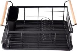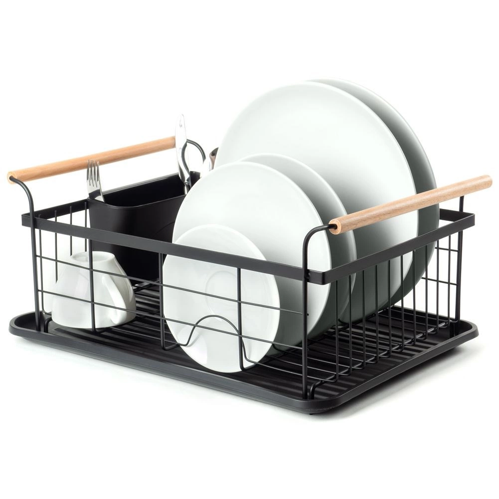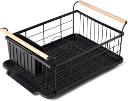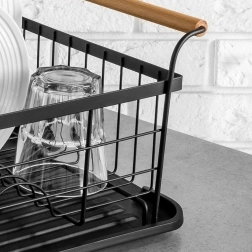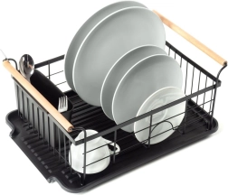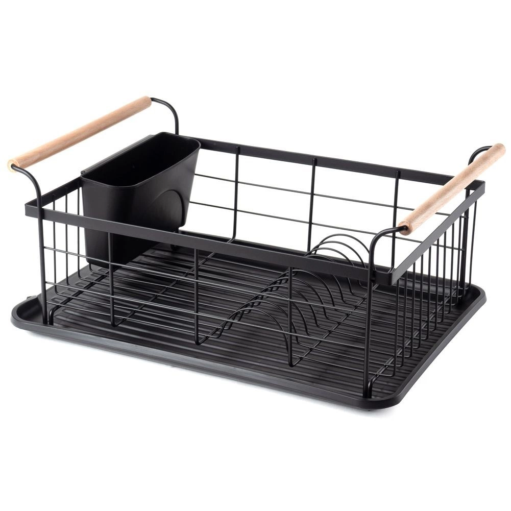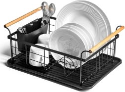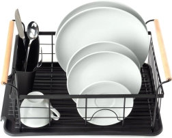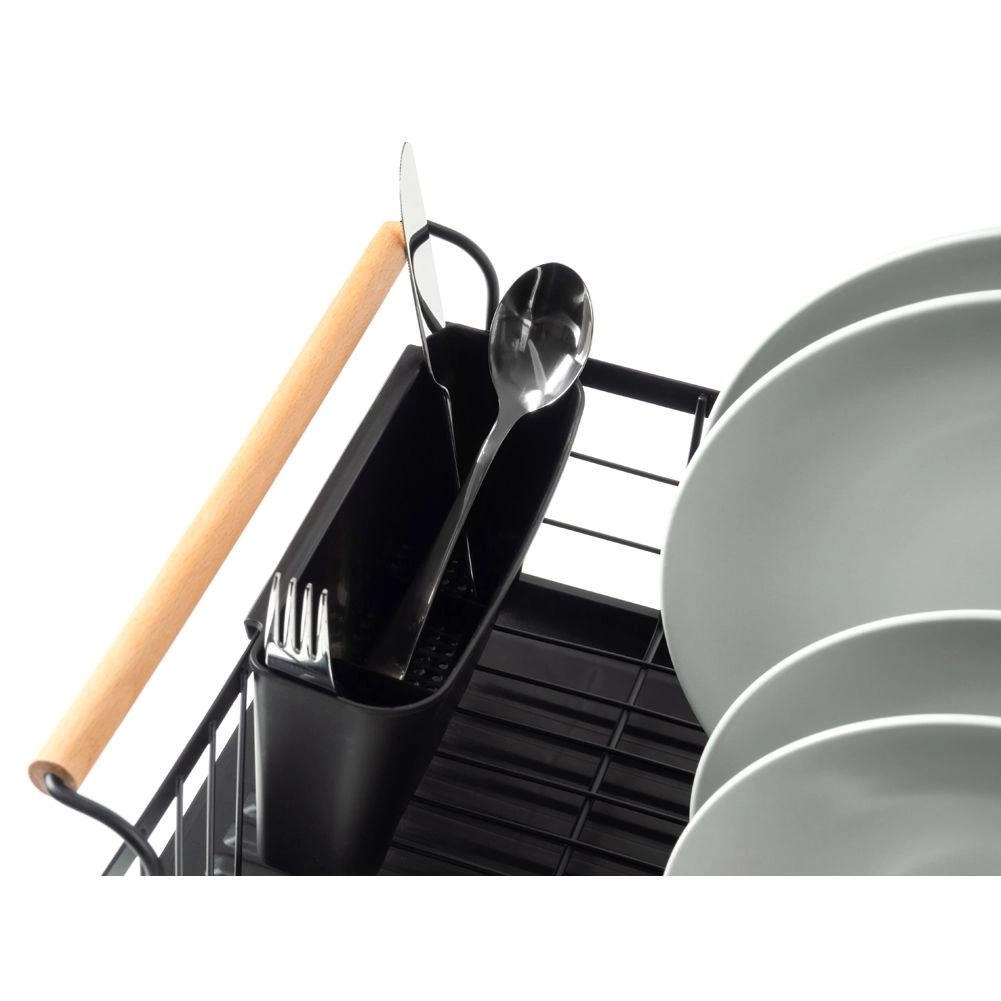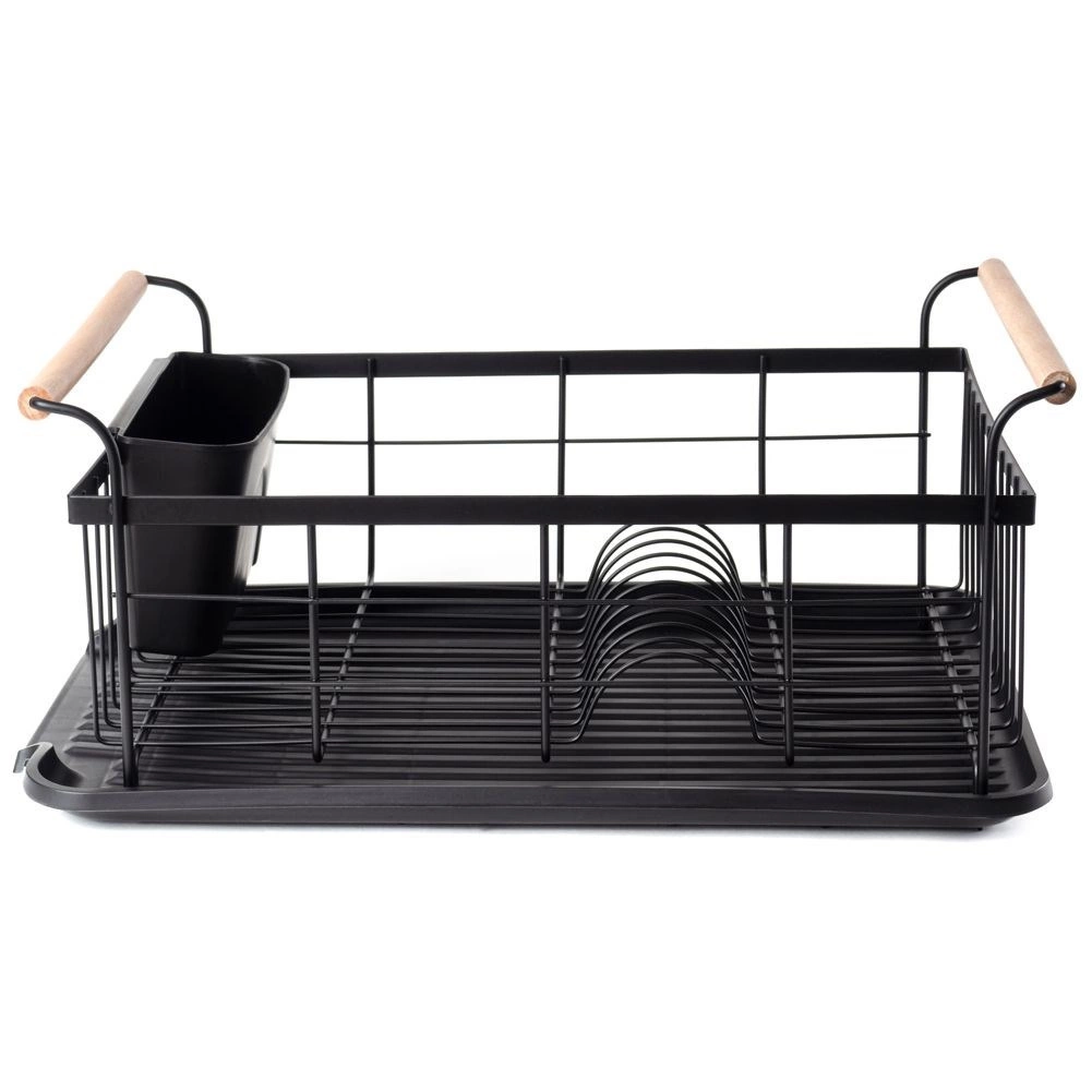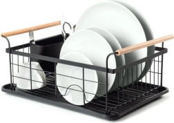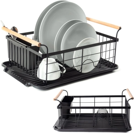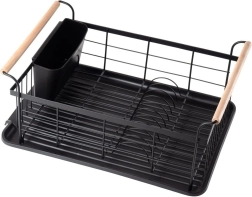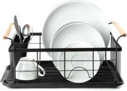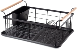 Elegantne ja funktsionaalne mustaks lakitud metallist nõudekuivatusrest ühendab vastupidavuse ja praktilised detailid taldrikute, klaaside ja söögiriistade mugavaks kuivatamiseks. Sooneline tilgutusalus püüab vee kinni ja kaitseb tööpinda, samal ajal kui väljatõmmatav söögiriistade korv hoiab korra majas ja tagab kiire kuivamise.