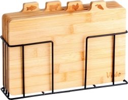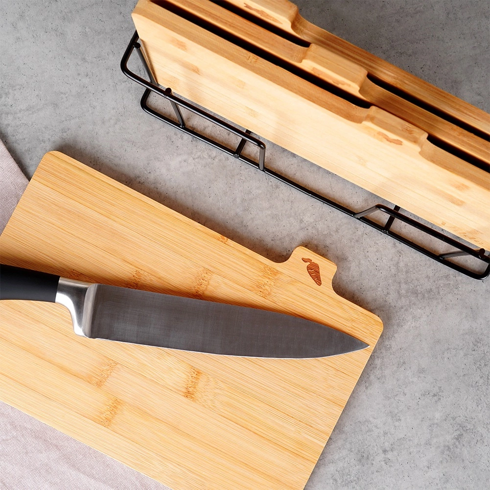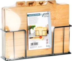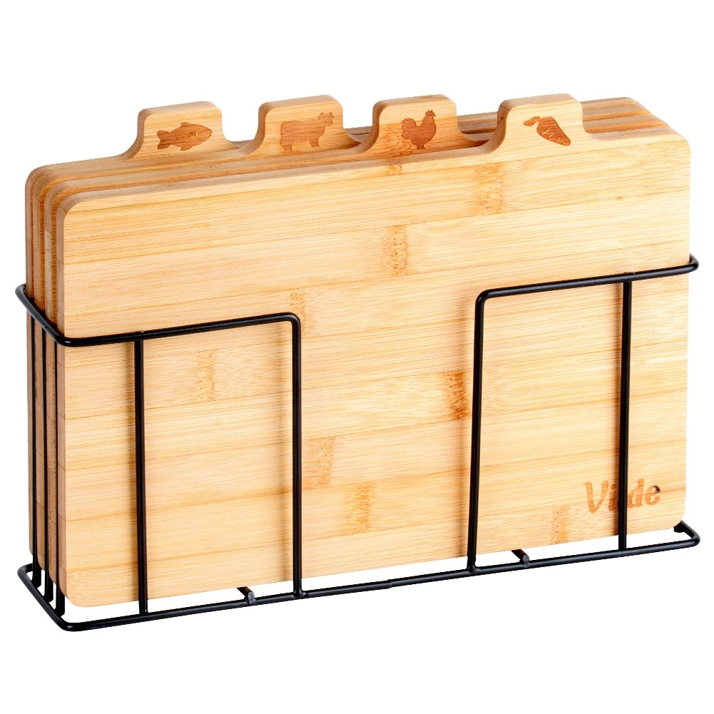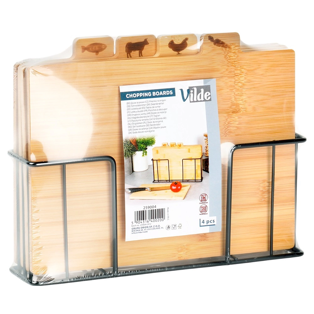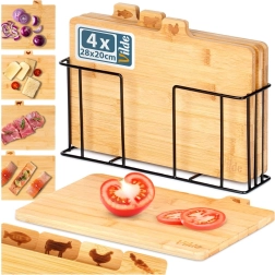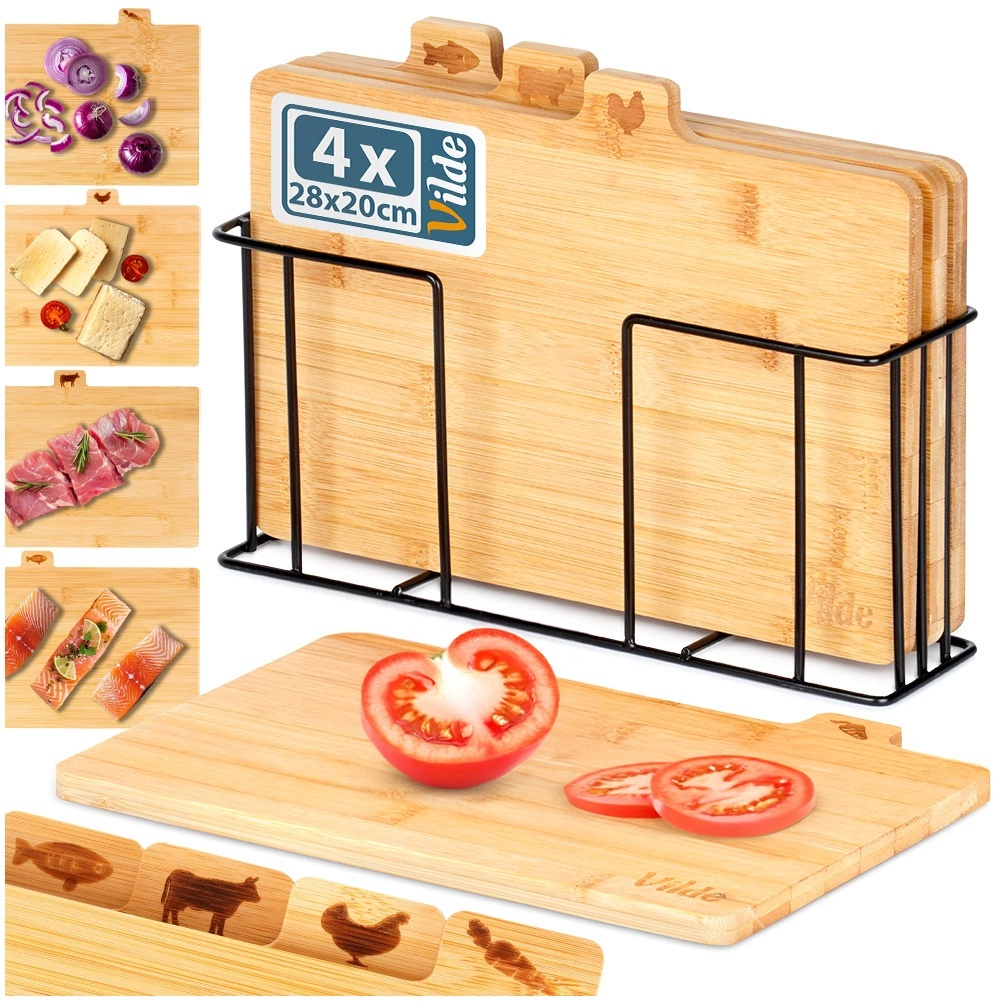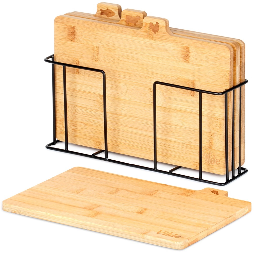 Selle bambusest lõikelaudade komplektiga hoiad köögi laitmatult korras. Neli eraldi lõikelauda koos praktiliste sakiliste kaartidega ja ikoonidega näitavad selgelt, milleks neid kasutada – köögiviljadele, linnulihale, lihale ja kalale – toetades hügieenilist toiduvalmistamist. Stabiilne must metallhoidik tagab, et lõikelauad on alati käepärast ja korrektselt paigutatud.