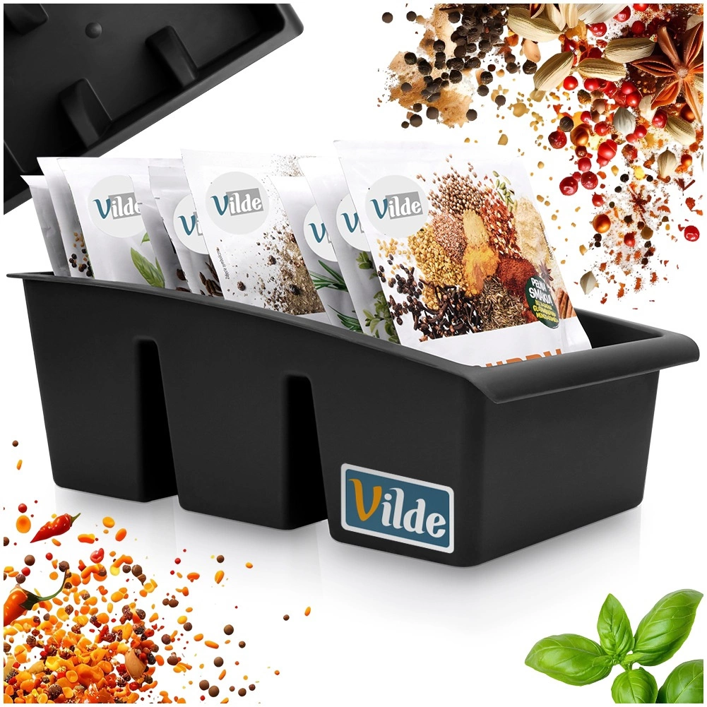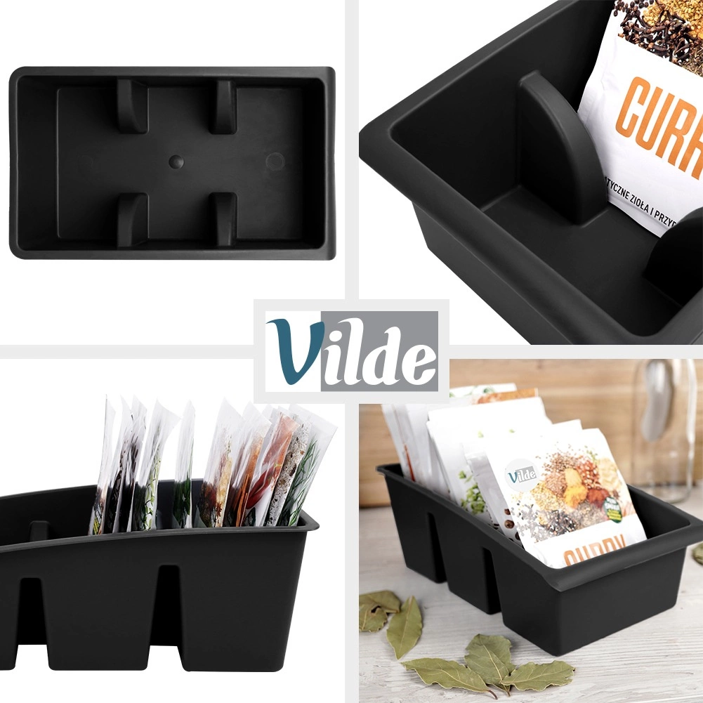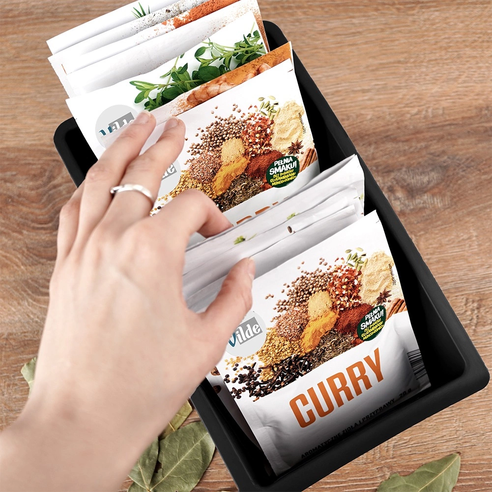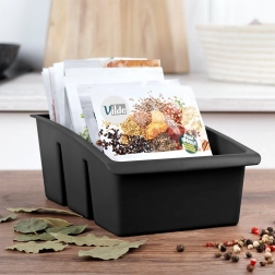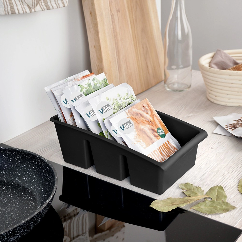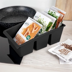 See praktiline köögikorraldaja on mõeldud maitseaine- ja ürdikotikeste selgeks hoiustamiseks. Kolm eraldatud sektsiooni hoiavad kotikesed stabiilselt püstises asendis, nii et leiad alati kiiresti vajaliku. Must viimistlus sobitub igasse moodsasse kööki ja vastupidavat materjali on lihtne puhastada.
