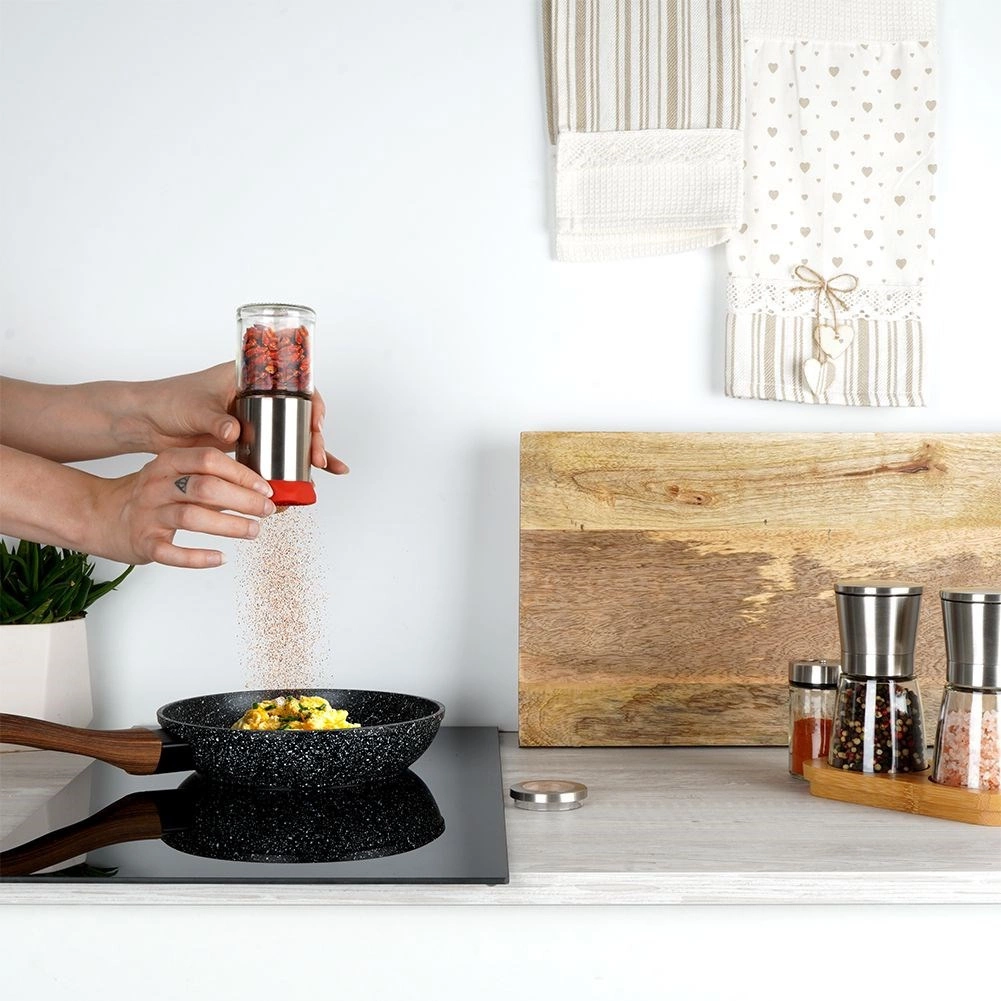See käsiveski on loodud erksa maitsega roogade austajatele. Roostevabast terasest mehhanism lõikab õrnalt kuivatatud tšillipipraid, maitseaineid ja ürte, säilitades nende intensiivse aroomi ja maitse ilma soovimatu purustamiseta. Klaasanum võimaldab sisu ja koguse hõlpsat kontrolli.
