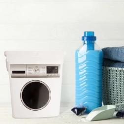 Hoia kord pesuruumis ja vannitoas. Pesumasina motiiviga konteiner pakub piisavalt ruumi pesuvahenditele ning tänu suletavale kaanele aitab säilitada nende värskuse ja lõhna. Vastupidav kvaliteetsest valgest plastist teostus on lihtsasti hooldatav ja sobitub suurepäraselt igasse interjööri.