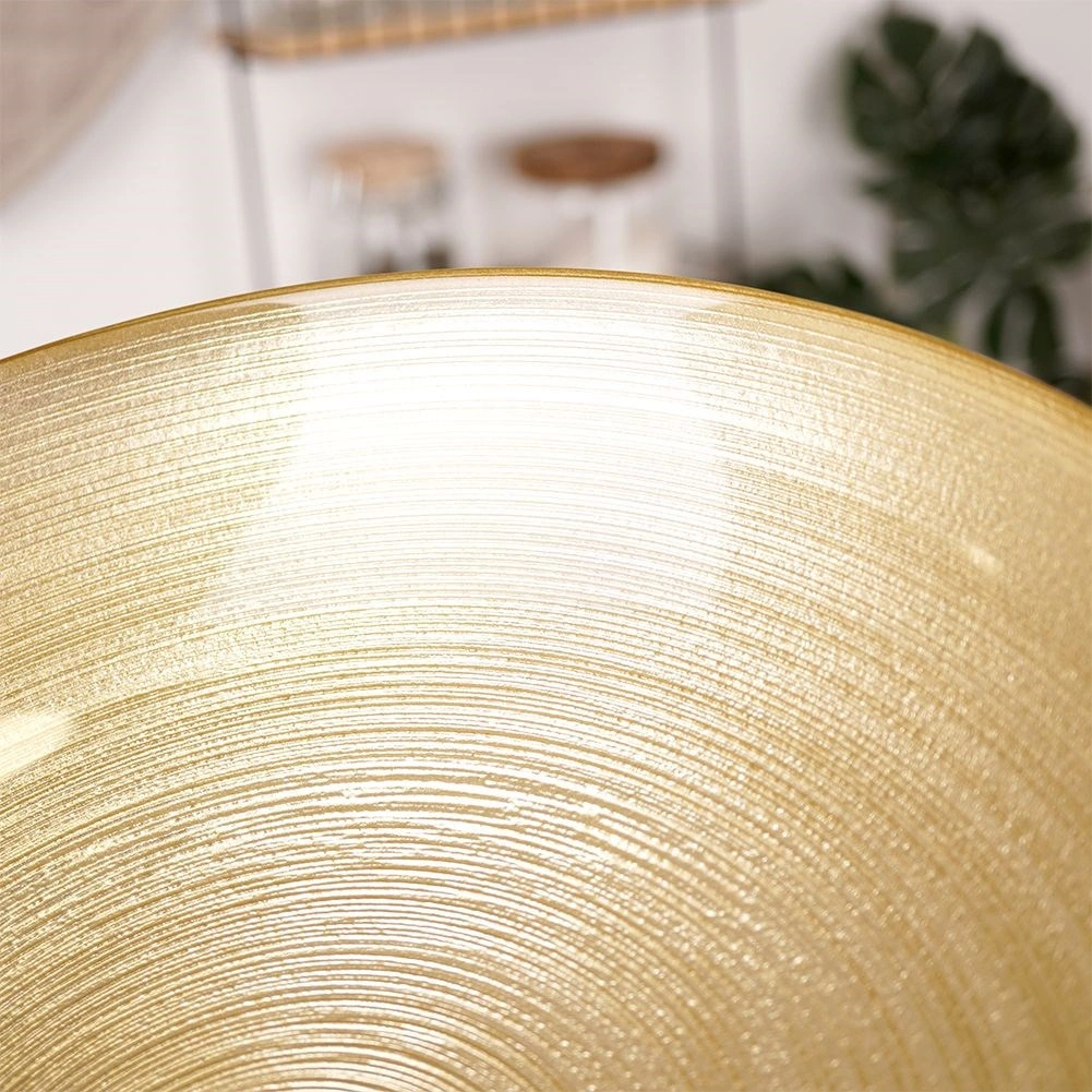 Stiilne kuldne klaaskauss on teie laua pilgupüüdja. Tänu suurele 30 cm läbimõõdule ja 2,2-liitrisele mahule sobib see köögivilja- ja puuviljasalatite, snäkkide või puuviljade serveerimiseks ning toimib ühtlasi dekoratiivse vaagina.
