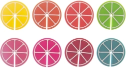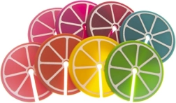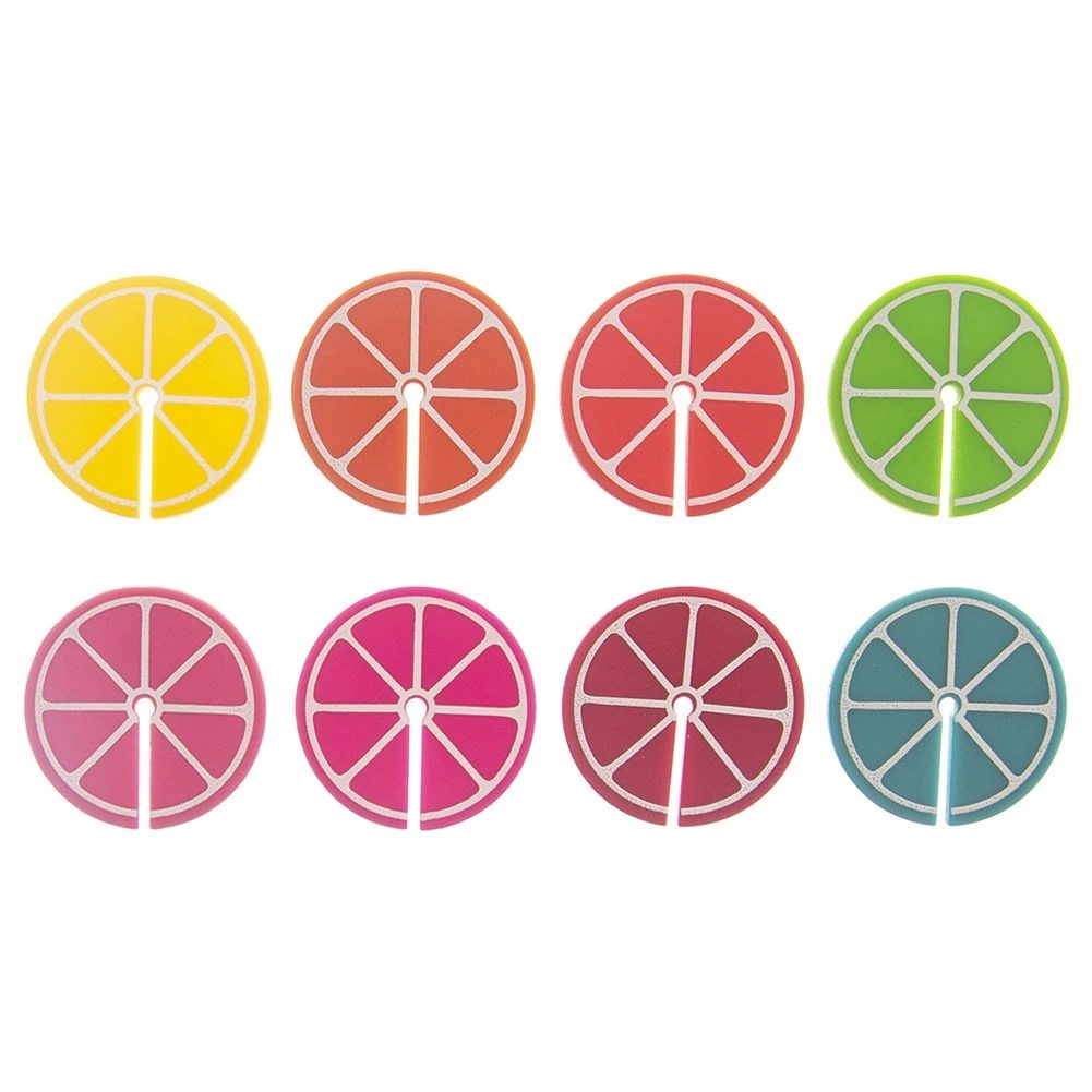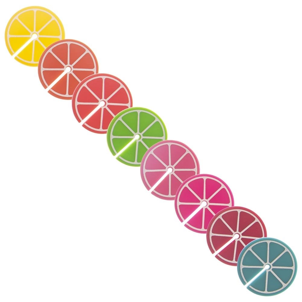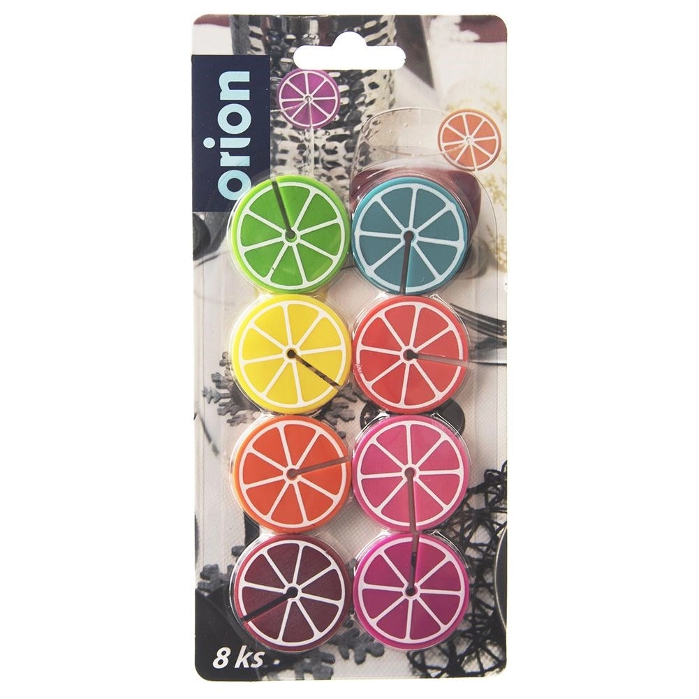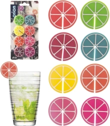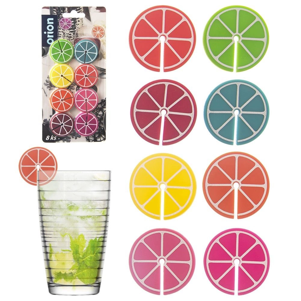 Praktiline 8 värvilise klaasi- ja pokaalitägi komplekt tsitruselõikude kujul, läbimõõt 3,7 cm. Tänu erinevatele värvidele leiab iga külaline oma joogi hõlpsasti üles. Valmistatud silikoonist, sobivad korduvale kasutamisele, ideaalsed pidudeks ja perekondlikeks koosviibimisteks.