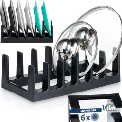 Praktiline kaante ja taldrikute hoidik mõõtudega 28 × 15 × 9 cm, mahutab kuni 6 eset. Tänu vastupidavale plastile mustas värvis on see kerge, lihtsasti puhastatav ja kauakestev. Sellesse saab paigutada kaaned, lamedad ja osalt ka sügavamad taldrikud või lõikelauad, hoides köögikapi või sahtli korras.