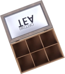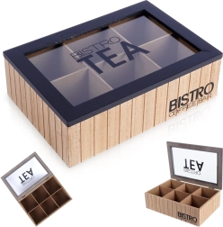 Too kord oma teekollektsiooni elegantsesse karpi, mis ühendab praktilise jaotuse ja atraktiivse disaini. Kuus eraldatud lahtrit võimaldavad sorteerida erinevaid teesid ja maitseid, samas kui musta raamiga klaasist kaas annab kiire ülevaate sisust. Ideaalne koju, kohvikutesse, bistroodesse või kontorisse.