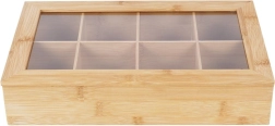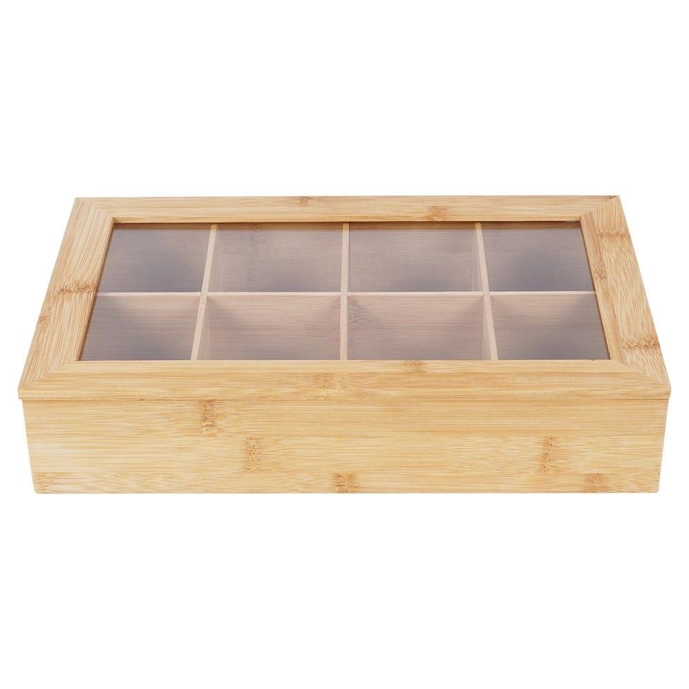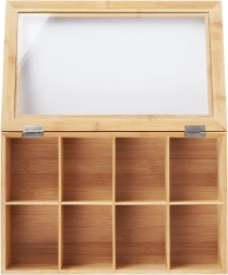 Elegantne bambusest teekarp 8 sahtliga ja läbipaistva kaanega hoiab sinu lemmikteed korrapäraselt järjestatuna ning kauem värsked ja aromaatsed. Looduslik bambus on niiskuskindel, ei deformeeru ega ima lõhnu, mistõttu sobib suurepäraselt nii kööki kui ka toitlustusse.